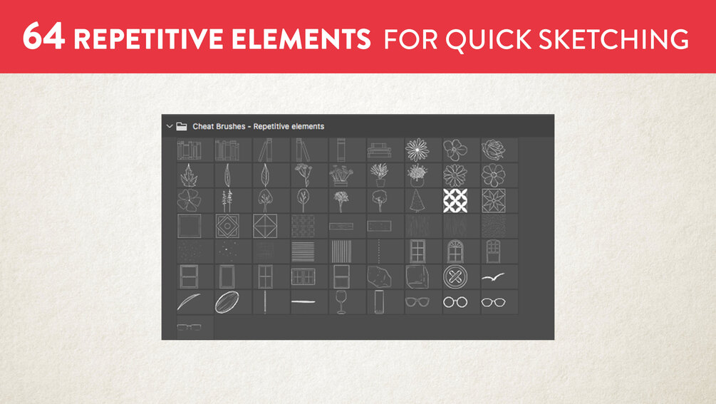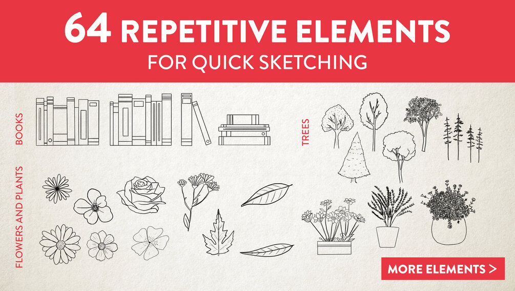 As professional illustrator I find sketching some objets and textures terrible boring and time wasting. Things as wooden boards, shelfs with books, trees in a forest, infinite number of flowers or windows in a city skyline, etc... can take really a lot of time!